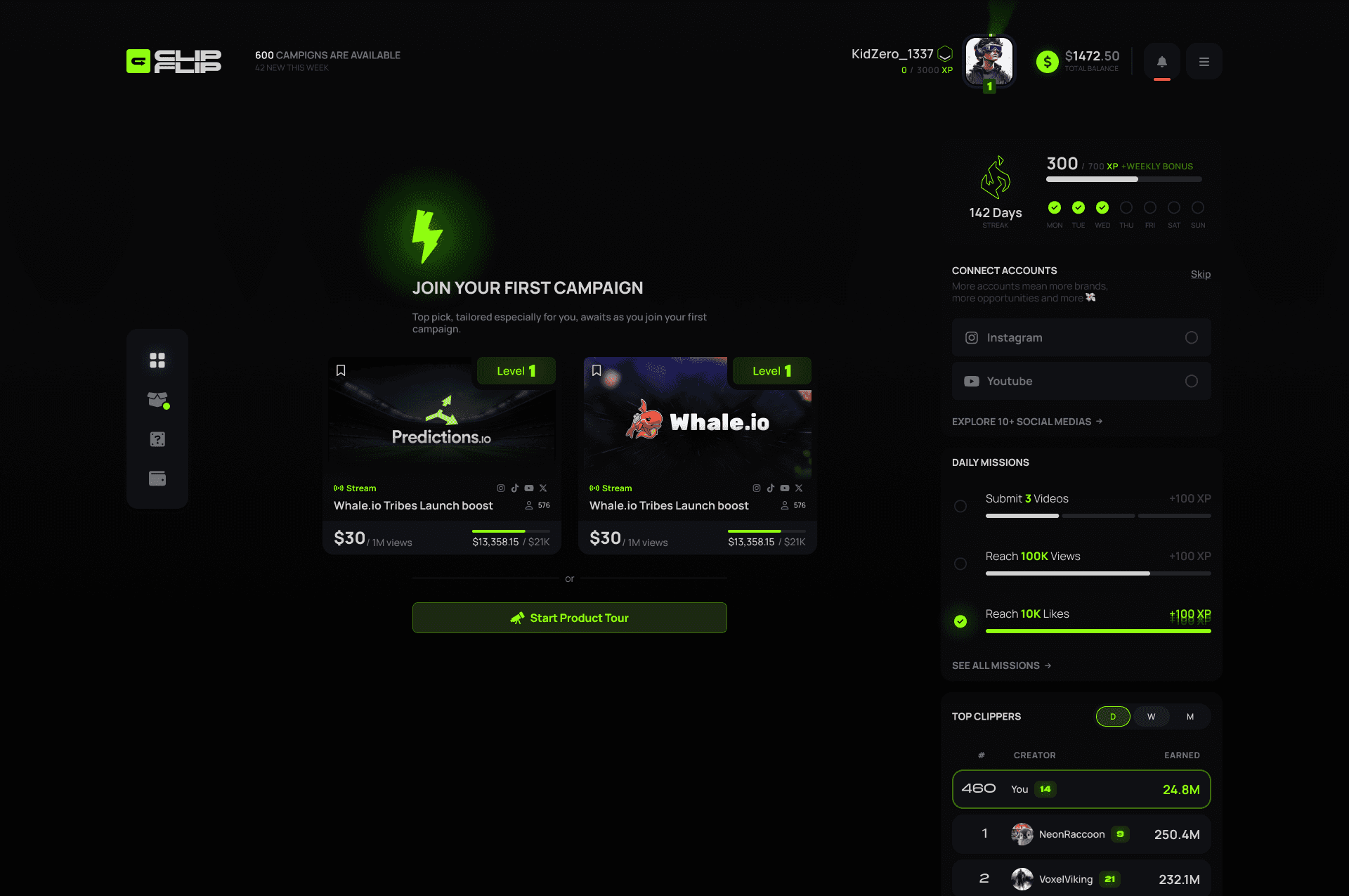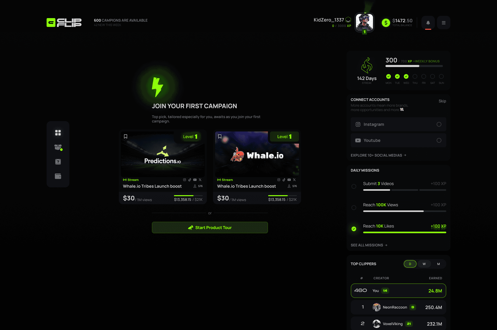 A marketplace where brands pay creators per view, built with a gamified clipper portal and a full campaign management suite for advertisers.